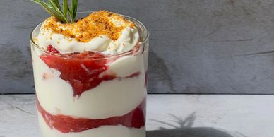 3. Once chilled, assemble in 4 glasses, alternating layers between the rhubarb and cream until the glasses are filled. Top with crumbled cookies and a small sprig of rosemary to garnish. Serve.