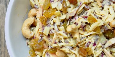 3. Just before serving, fold in the cashew nuts. Sprinkle with the remaining 2 tablespoons golden raisins. Serve!